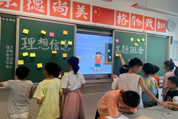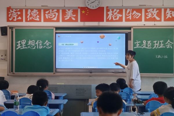 (通讯员 张思雨)7月19日上午,为让学生们理解理想信念的重要性,明白理想是什么以及为实现理想需要做些什么,36365线路检测中心入口“青”云直“尚"队在衡阳市常宁市尚宇高级中学小学部教室举办第二期红色论坛。此次红色论坛以“理想信念”为主题,并班会的形式开展。队员张思雨和欧阳晴担任此次红色论坛的主讲人,助教郭安琦和郭嘉明辅助教学并维持课堂纪律。