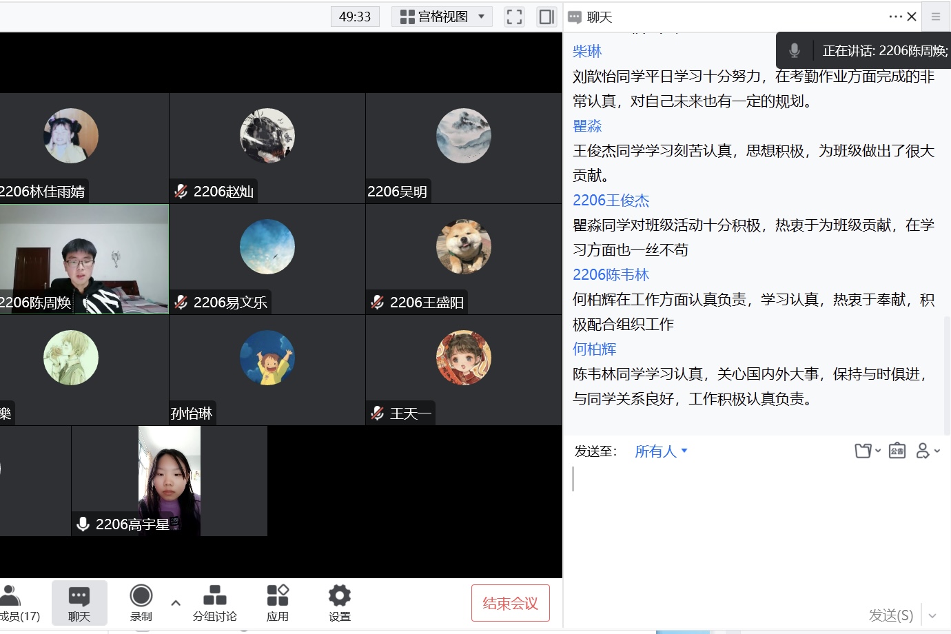 团支书牟敏主持此次大会并致开幕词,对过去一学期的学习和生活进行总结,各支部成员依次用简短的语言对过去一学期的个人表现进行总结,既有对自我成绩的肯定,又有对表现不足方面的反省,既有在政治思想方面的总结,又有在学习方面的总结,并据此提出自我改善方案,其他团员根据自我评价对其进行评议补充,肯定成绩,指出不足。支部委员会综合个人自我评价和其他团员的评议对每名团员提出整改方建议。