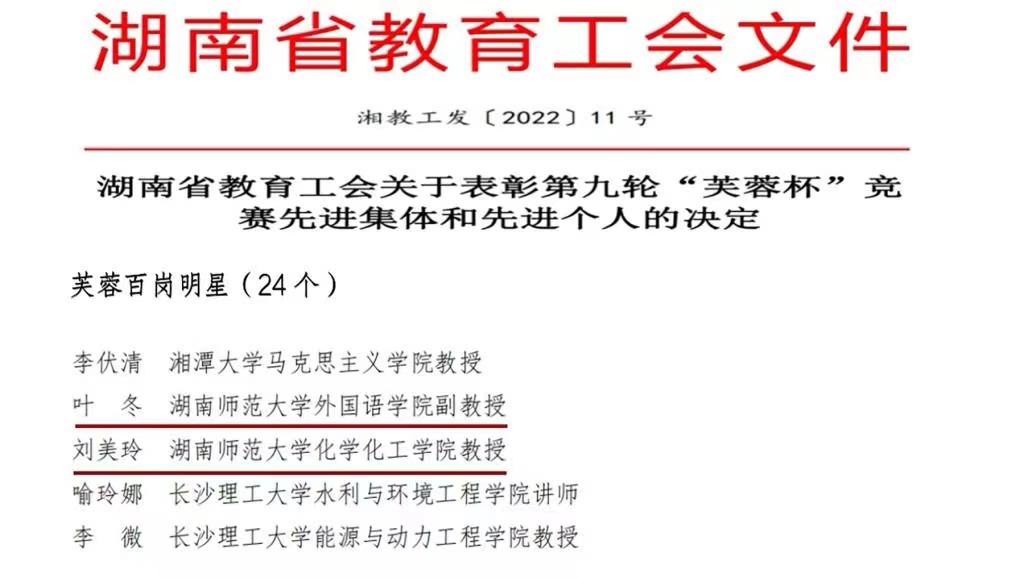 12月19日,湖南省总工会发布《关于全省第九轮女职工“芙蓉杯”竞赛总结评估情况的通报》,36365线路官网教师刘美玲教授荣获湖南省“芙蓉百岗明星”称号。